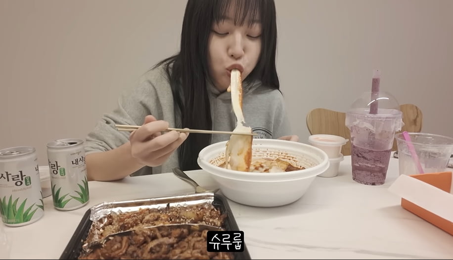 먹방을 시작하기 전에 음료수를 컵에 콸콸콸 담는 모습이 유명해서 '주유, 쯔유소'라는 별명도 있어요. 그녀는 주로 아침에 사과와 초록매실을 선호한다고 해요.