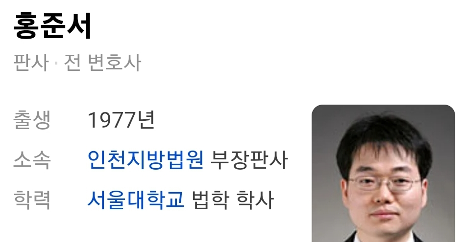 이번 사건을 담당한 홍준서 판사는 1977년 출생으로, 서울대학교에서 법학 학사 학위를 받았어요.